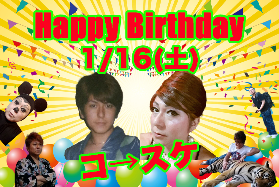 お楽しみ企画❤️笑 2021 / 01 / 13 🎂お誕生日会🎂 🎉お誕生日🎉 🎉おめでとう🎉 我らが、『お母さん』こと、 コ→スケのお誕生日会、、、 やっちゃいまーす!! 1/16(土) 営業時間は、時短のため・・・ 17時〜21時⭐️ 短い時間だけど・・・ みんなでお祝いしてあげてね⭐️